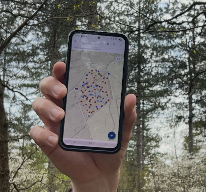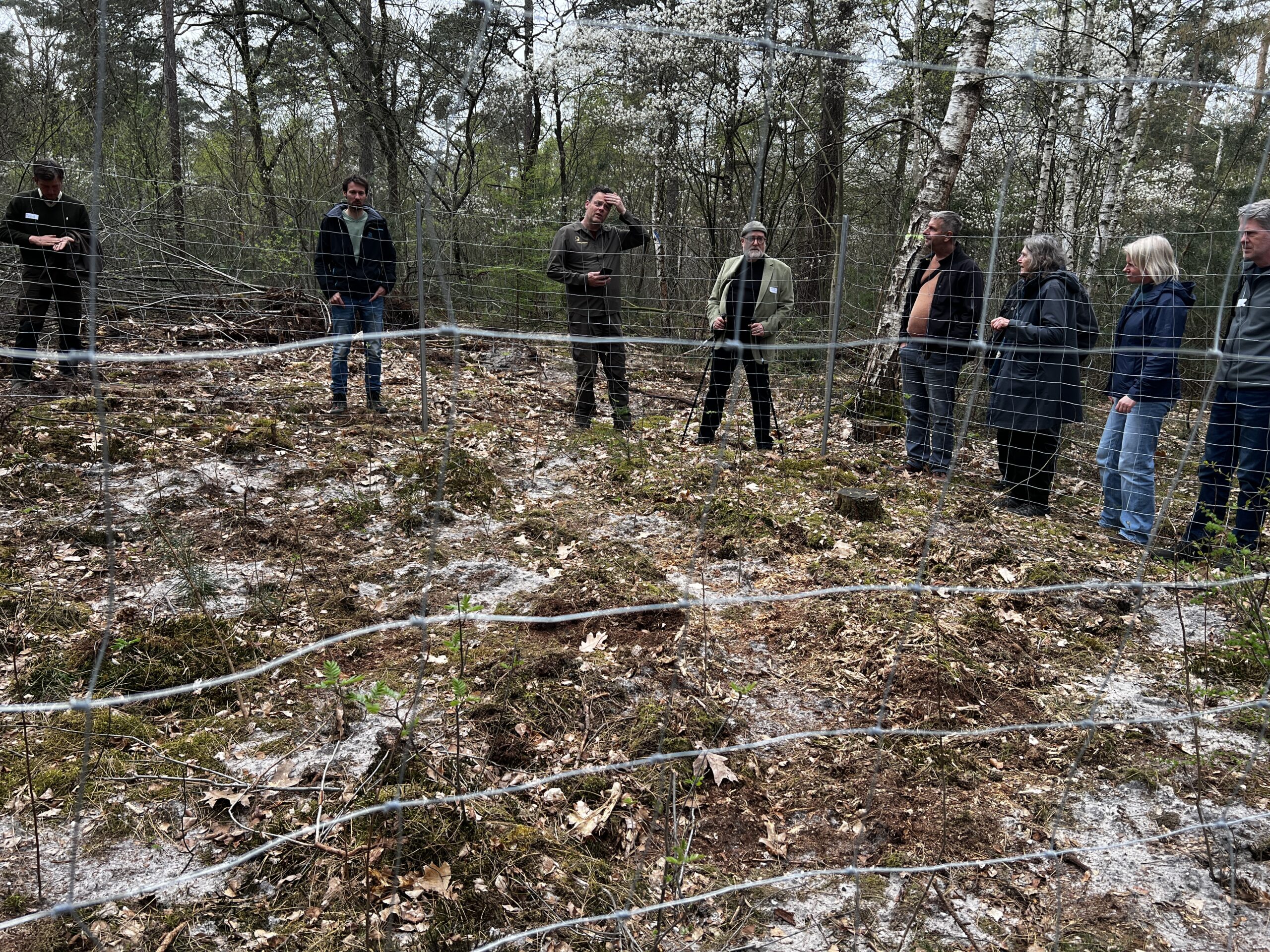 Voorafgaand aan de excursie gaf Martijn Bergen van Bosgroep Midden-Nederland alvast een korte toelichting: “We werken samen met Staatsbosbeheer in Utrecht aan een mini-LIFE Climate Forest. Hierbij hebben we op drie locaties bij drie leden van ons – waaronder Landgoed Pijnenburg – heel kleine plots van 5 hectare ingericht om alle dingen die we aan het leren zijn met z’n allen op het gebied van klimaatadaptatie en bosvitaliteit uit te rollen. We hebben hier wat rasters geplaatst en aan bostracken gedaan.”